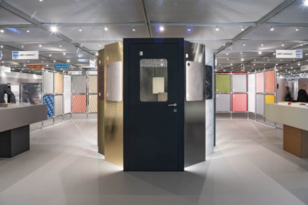 Xilografia has created for Abet the exhibition at SICAM at the Pordenone Fair. The exhibition area is developed around a central area, the Agora, a place that offers space for furnishing elements. On either side of the area there are six displays with the newest laminates of the Abet collections. The exhibition space ends with a wall on which a large ‘A’ composed of more than 4000 sample cards, all decors from the Colours collection.